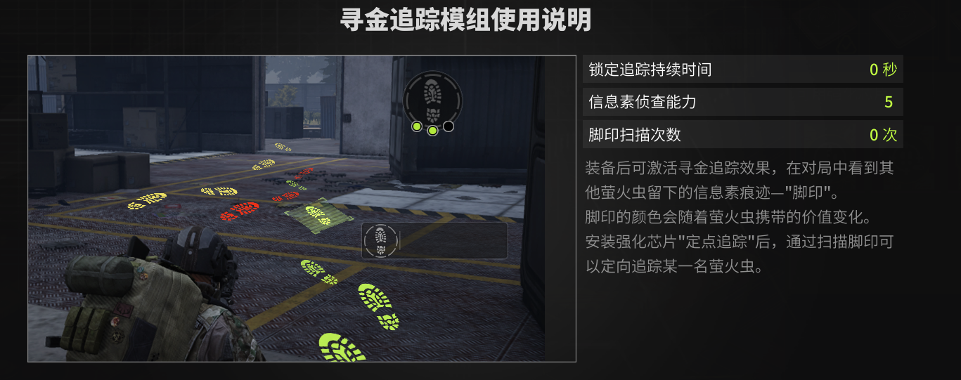 2:定点追踪芯片:可以通过扫描脚印激活定点追踪,激活定点追踪后,只会显示这名萤火虫的脚印,方便追踪高价值物资的携带者。