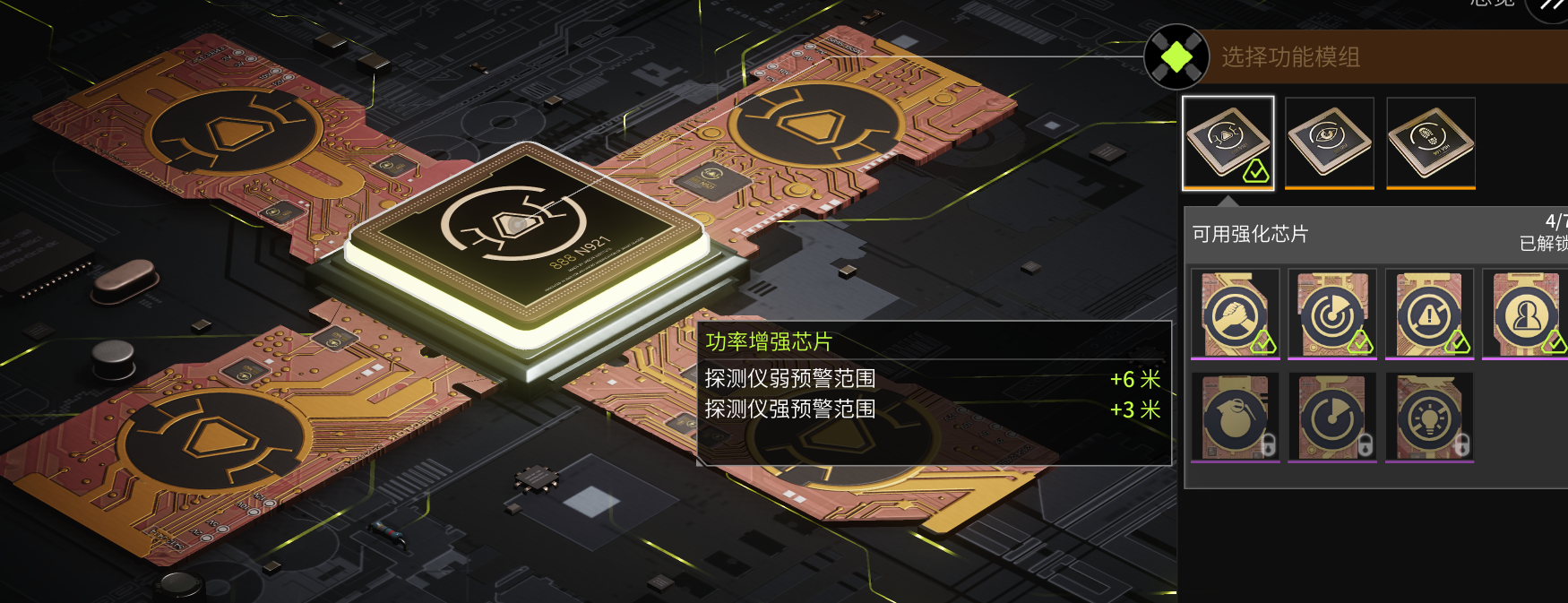 危险预警模组的插件也非常实用,比较关键的是无害伪装芯片,能让敌人的危险预警模组无法判断距离,优先携带。其次是功率增强芯片,可以微微放大危险预警的范围,扩大自己的警戒区域。