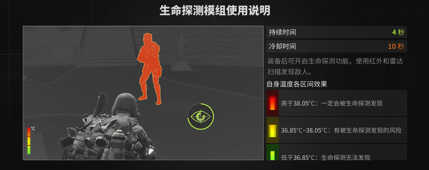 生命探测模组同样有自己的优劣,优势在于它范围较大,并可以扫到敌人所在的具体位置,劣势则在于如果敌人在某些位置蹲点,体温较低,就无法被生命探测模组发现。