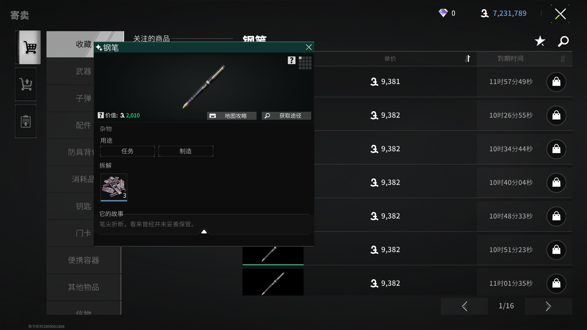 作业箱和棉签在游戏中爆率不高,比较稀少,如果需要的话,还是从寄卖市场采购比较好。其中,作业箱做任务会给许多,每天可以在交易市场购买一个,如果不是急着冲建筑等级,其实也并不是非常缺,棉签在刷医疗物资的地方(比如巴夫工厂废水池)会刷新,但爆率也不高。这两件商品在交易市场的售价高昂,但好在用量较少,可以通过摸两局金来消费购买。