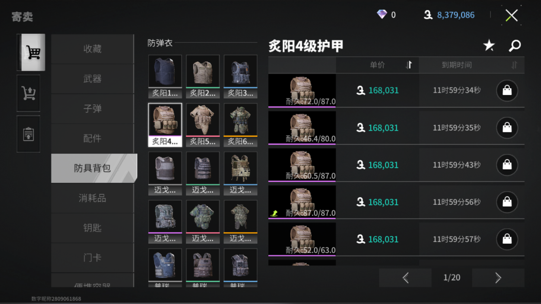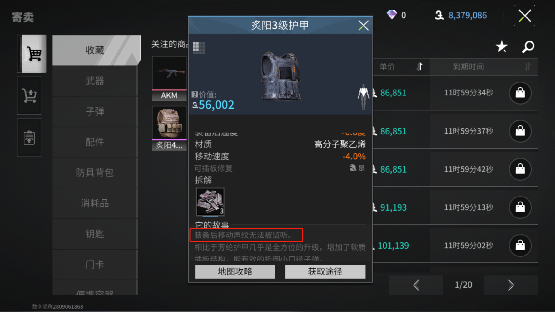 这里根据护具的实价来,选择你能接受的高级护具就行,不必在意效果,虽然大家都在推荐四级以下的炙阳甲,有静音的效果,但价格实在是有点贵,玩一局成本挺高,对于萌新来说,更关注入局的性价比,和对拼的优势。