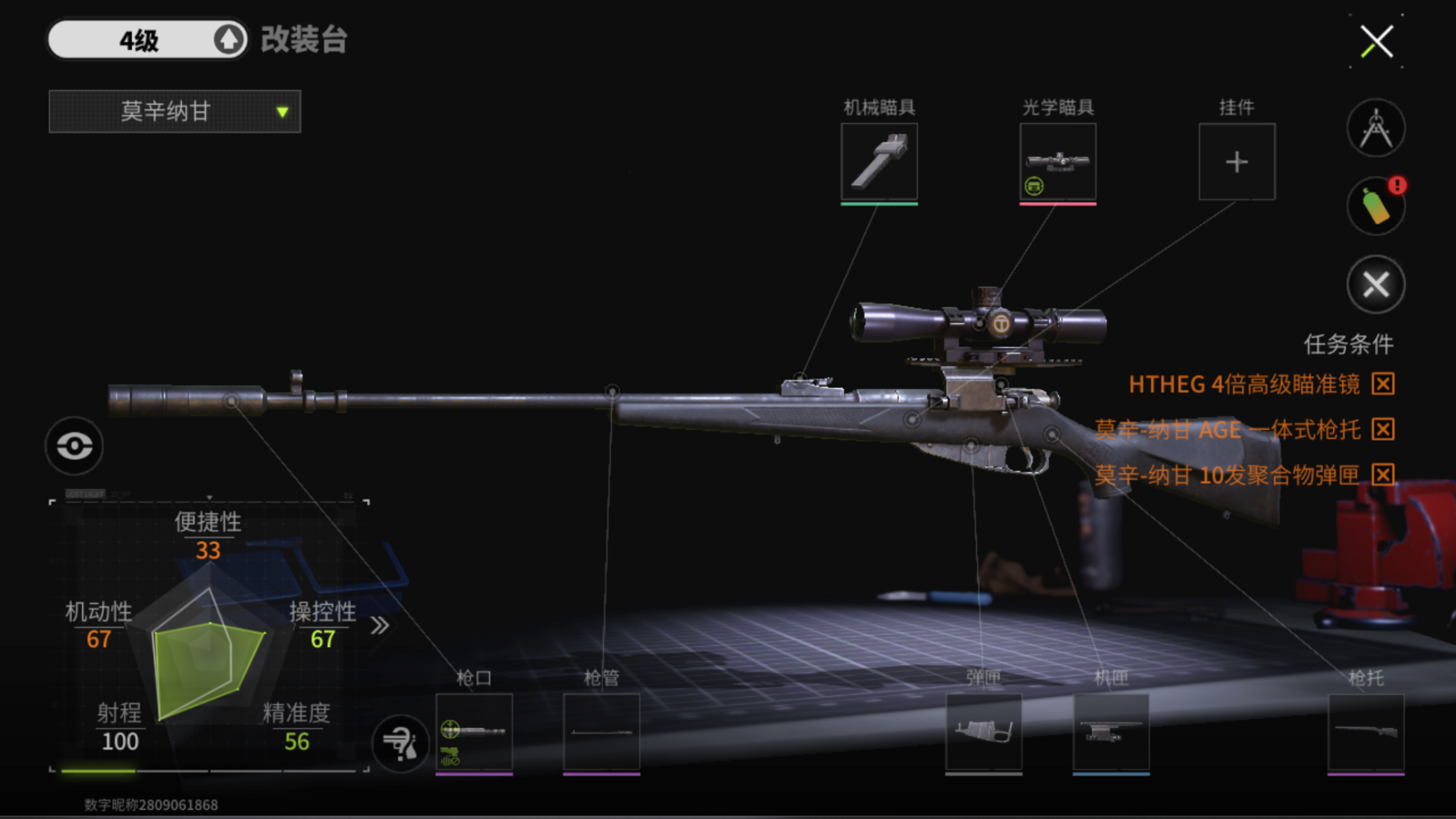 出了新手村,玩秋山之后的地图一般还要再配备一把狙,用莫辛纳甘加上5级高穿弹就可以了,成本不高,性能可靠,穿甲爆头一枪倒,倍镜选择四倍以上,枪口选消音,用来解决远处的敌人。