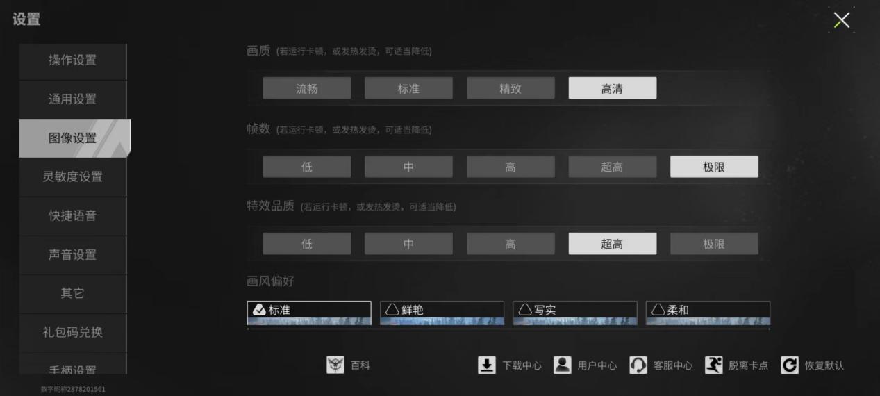 图像设置一般直接默认就是比较适合自己手机的,除非玩着一卡一卡的,那样的话就需要牺牲一定的分辨率和画质来维持正常游戏了,不过要注意一般而言我们不要随便降低帧率,FPS非常吃反应速度,帧率越高反应也就越快。