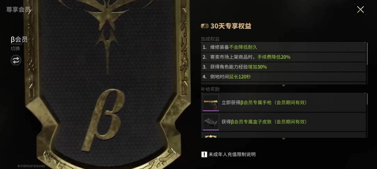 β会员的权益更注重游戏体验,其装备维修不会掉耐久,寄卖的手续费也降低了20%,经验获得增加30%;在局内我们倒地等待救援时间会延长120秒,建筑升级时间降低20%,海蒂商店子弹购买上限增加20%;最后对于跑刀玩家,β会员还会有β会员专属手枪,作战能力更上一层。
