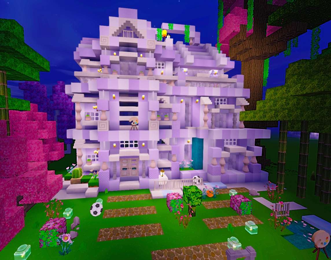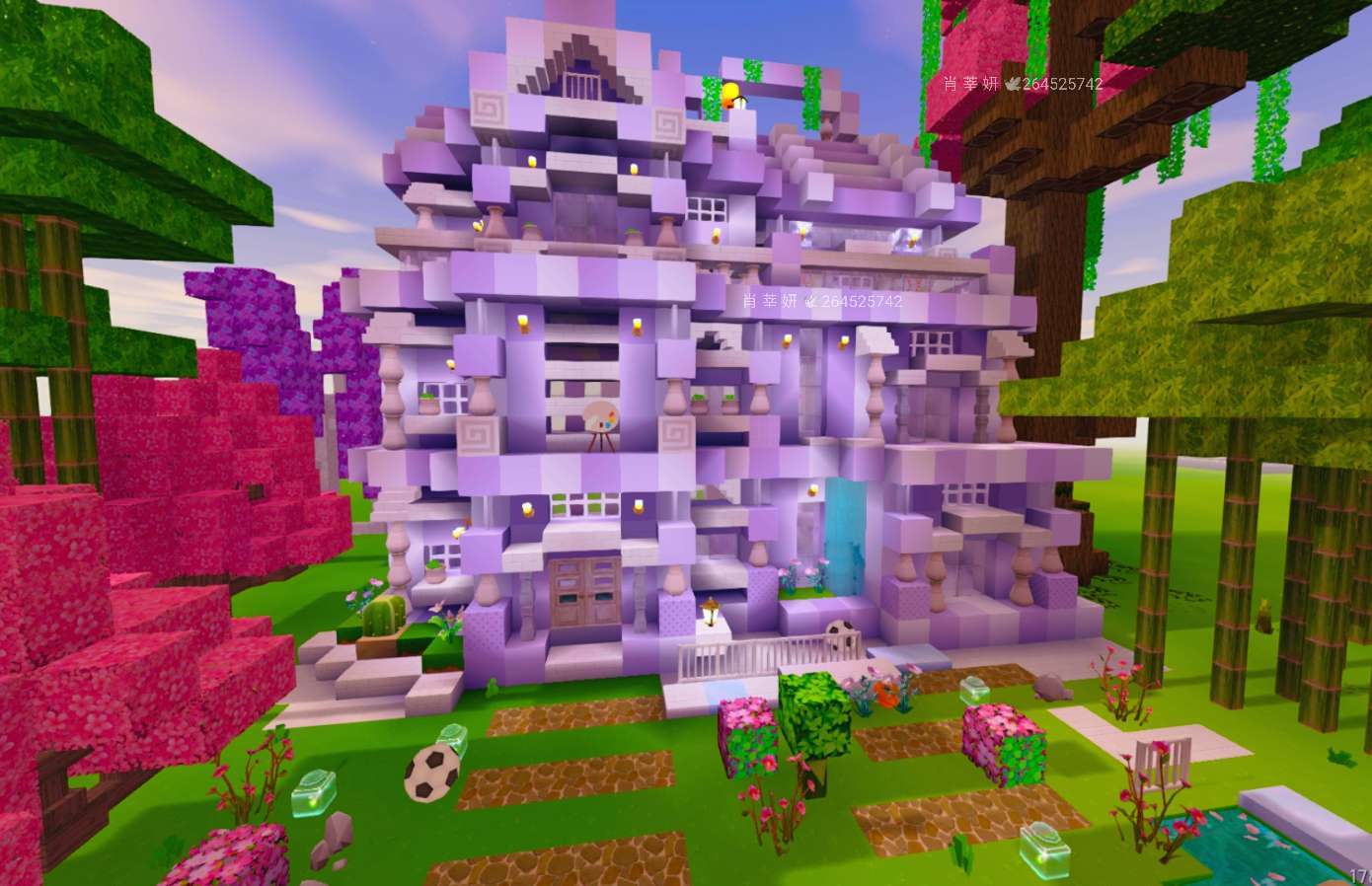 肖莘妍频道分享原创的迷你世界紫色三层别墅,展示了别墅的正面、框架、侧面、背面等不同视角,还祝大家六一快乐,同时说明模仿需艾特作者。