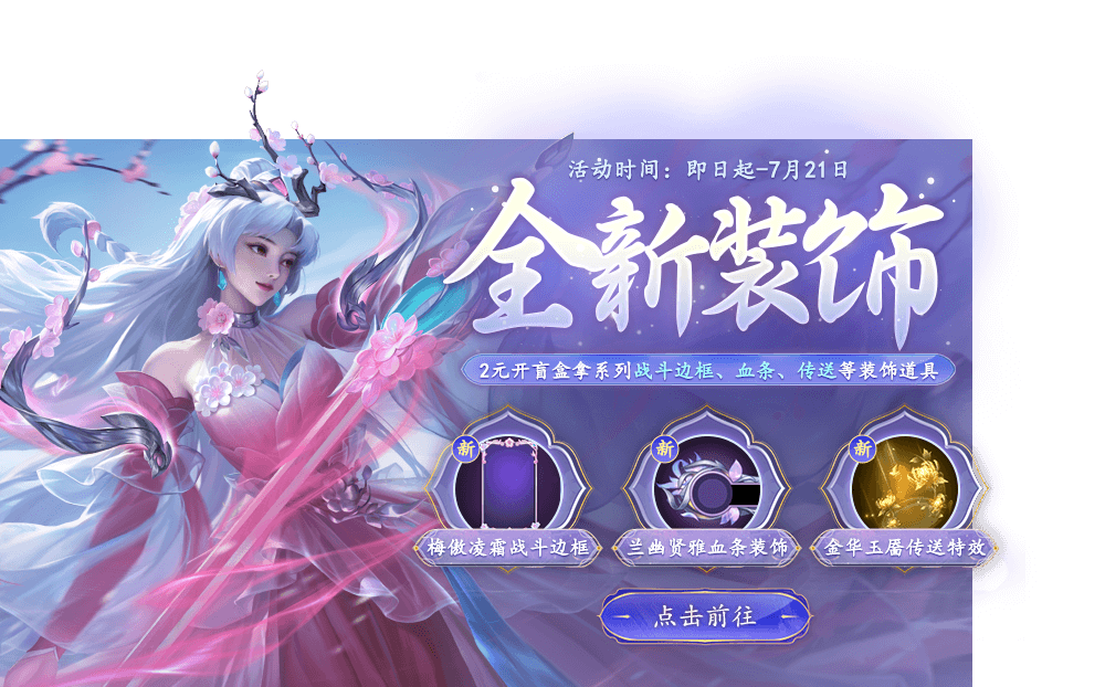 花费20点券可购买梅傲凌霜边框盲盒(不可交易),打开必得茶杯投影1天体验卡,并有机会获得梅傲凌霜战斗边框、灼灼芳华击败、兰幽贤雅头像框、菊逸芳隐头像、竹清谦澹聊天框、流芳一剑铭牌、菊逸芳隐表情等道具。