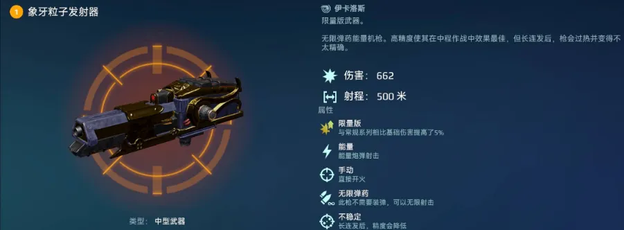 象牙粒子发射器属于高伤害中程武器,最远射程为500m,“无限弹药”与“高精准度”让其成为热门的中型能量机枪,被广泛应用在各类机甲身上。