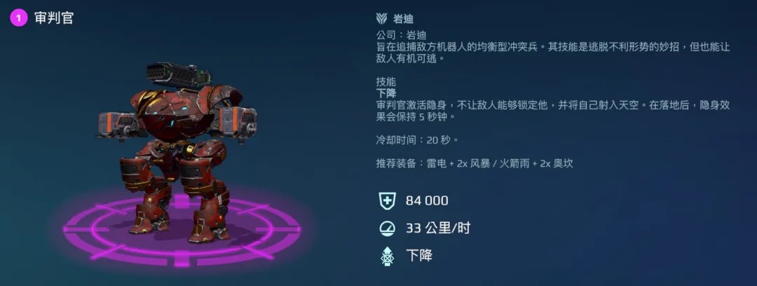 除了“法夫纳”,紫色机甲“审判官”也非常适合装备“象牙粒子发射器”,它的“下降”技能,可以使机甲升空并进入隐身状态,配合象牙无限子弹的能力,无论追击索敌,或是战后逃脱敌方锁定,都能轻松破局。