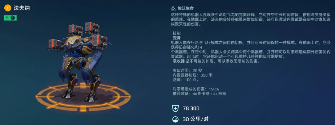 拥有4个中型武器槽的“法夫纳”能够将武器的效果“翻4倍”;飞行作战时在空中拥有良好视野,空中长时间滞留作战搭配武器的连续射击,更具机动性,可随时补刀,收割“人头”。