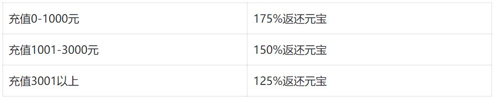 例:玩家充值480元,公测后返还元宝数量为480*175%*10=8400元宝;