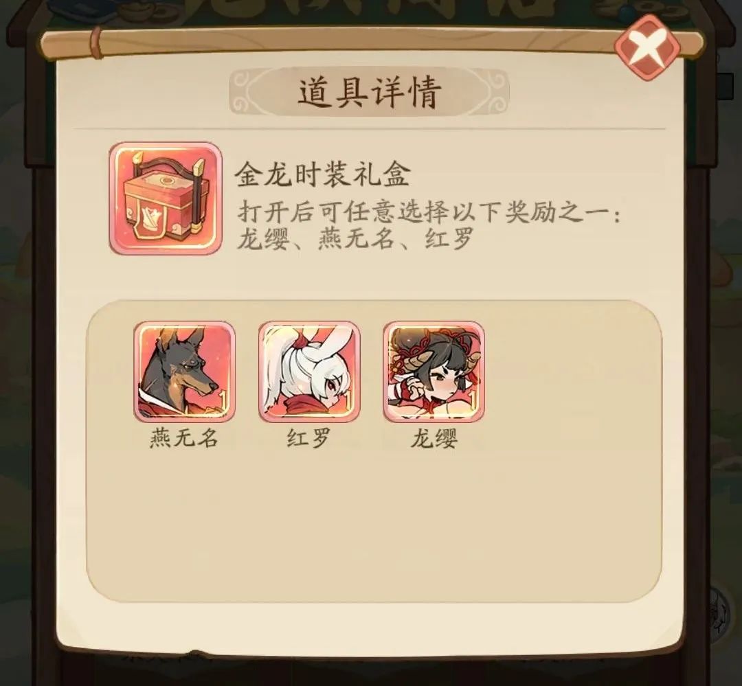 少侠可在商店兑换金龙时装礼盒,获取主角限时返场皮肤燕无名、红罗、龙缨(任选其一)!