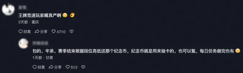 有的车手,请放心入,狠狠入。在《王牌竞速》,每赛季都能免费领取大量纪念币与王牌补给券福利:排位结算、日常任务、惊喜活动...一个赛季囤的币提走一台新车,到手即是整车,没有“升阶”骚套路。