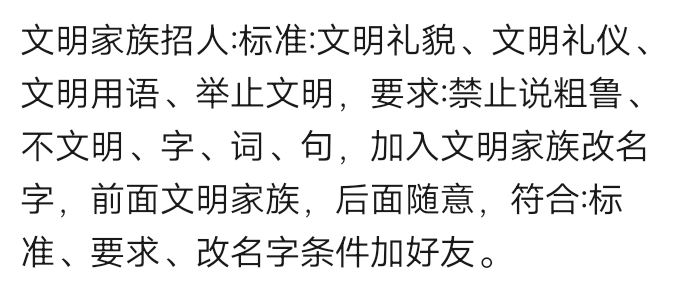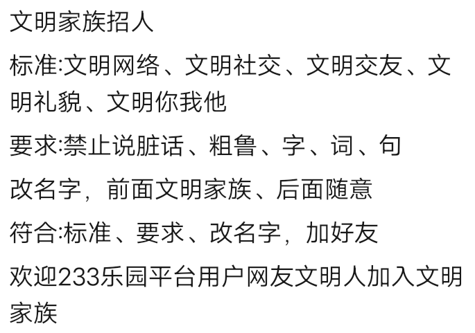文明家族招人:高素质,讲文明,可改名,不看重段位,粉丝,一切随缘。