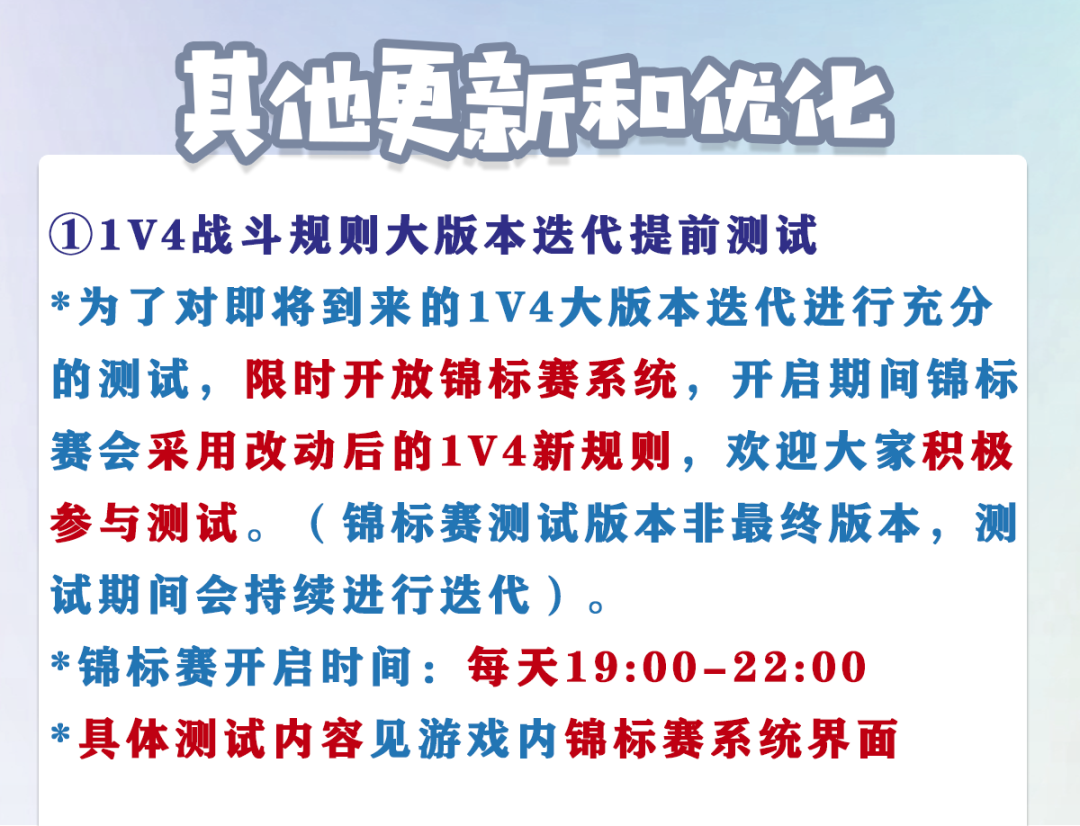 *为了对即将到来的1v4大版本迭代进行充分的测试,限时开放锦标赛系统,开启期间锦标赛会采用改动后的1v4新规则,欢迎大家积极参与测试。(锦标赛测试版本非最终版本,测试期间会持续进行迭代)。