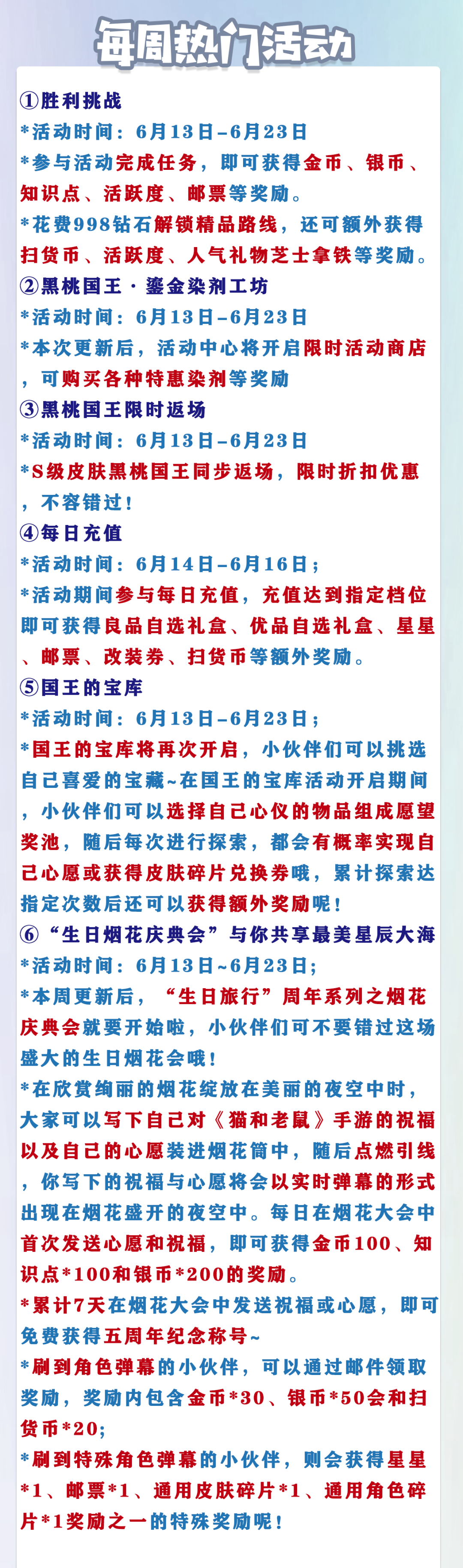 以上就是本周(6月13日)更新维护的全部内容啦!感谢小伙伴们对于《猫和老鼠》手游的支持和喜爱,愿欢乐永远陪伴大家左右!
