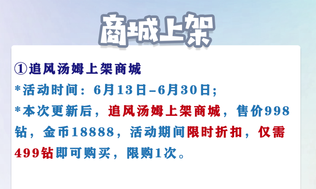 *本次更新后,追风汤姆上架商城,售价998钻,金币18888,活动期间限时折扣,仅需499钻即可购买,限购1次。