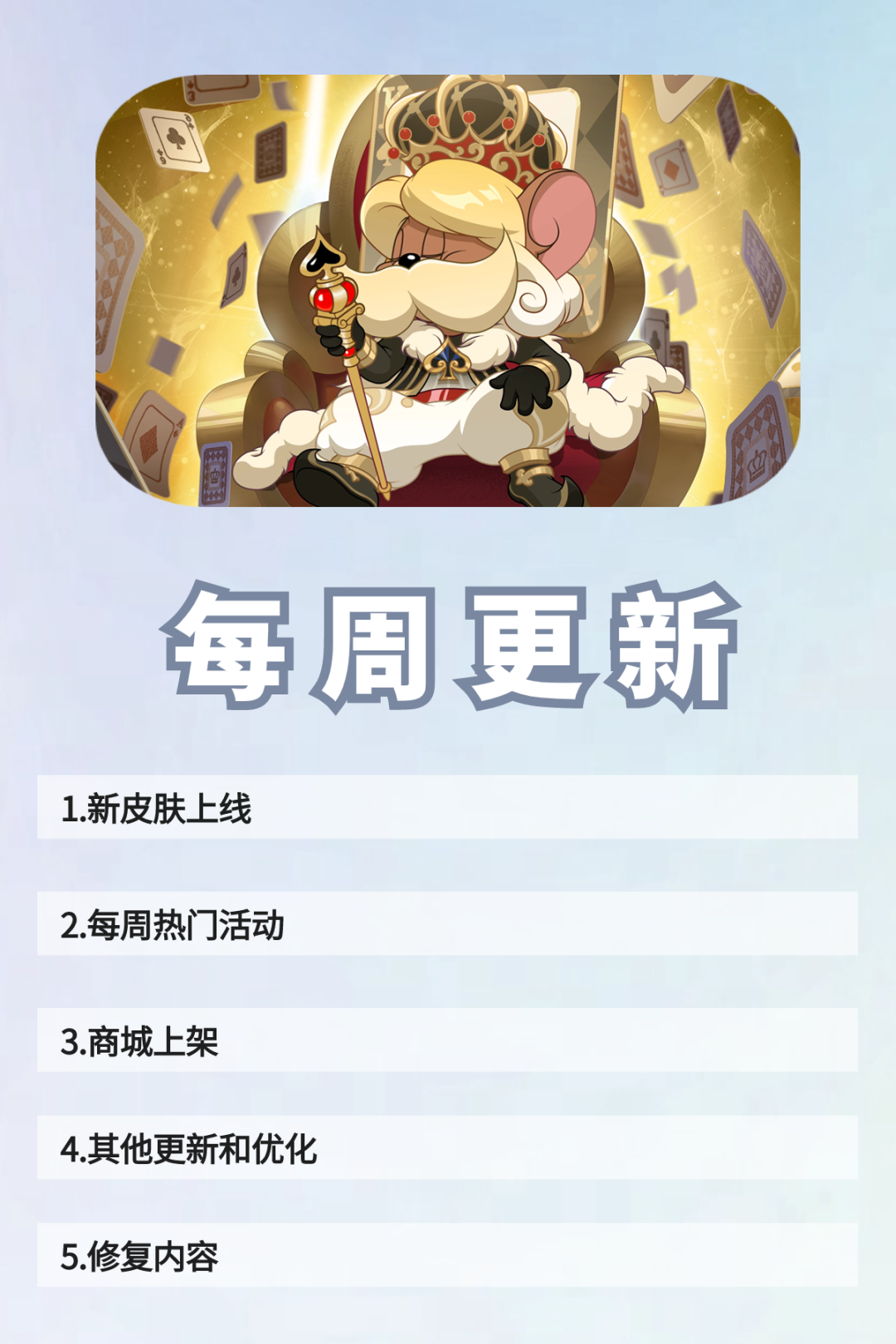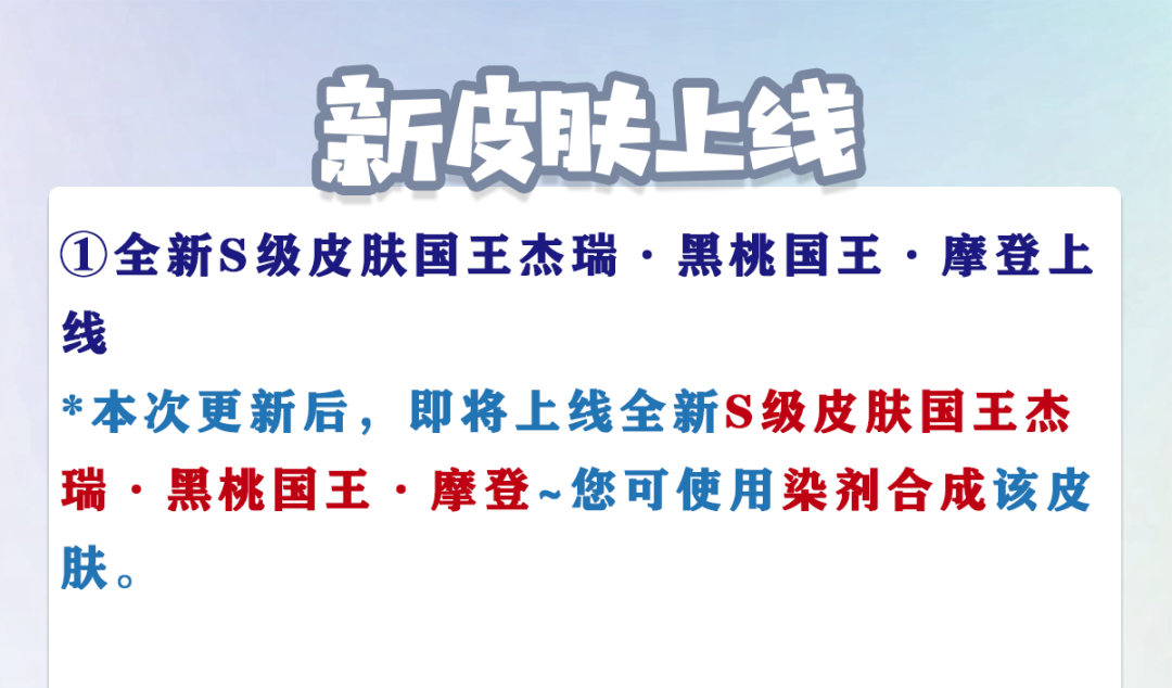 *本次更新后,即将上线全新S级皮肤国王杰瑞·黑桃国王·摩登~您可使用染剂合成该皮肤。