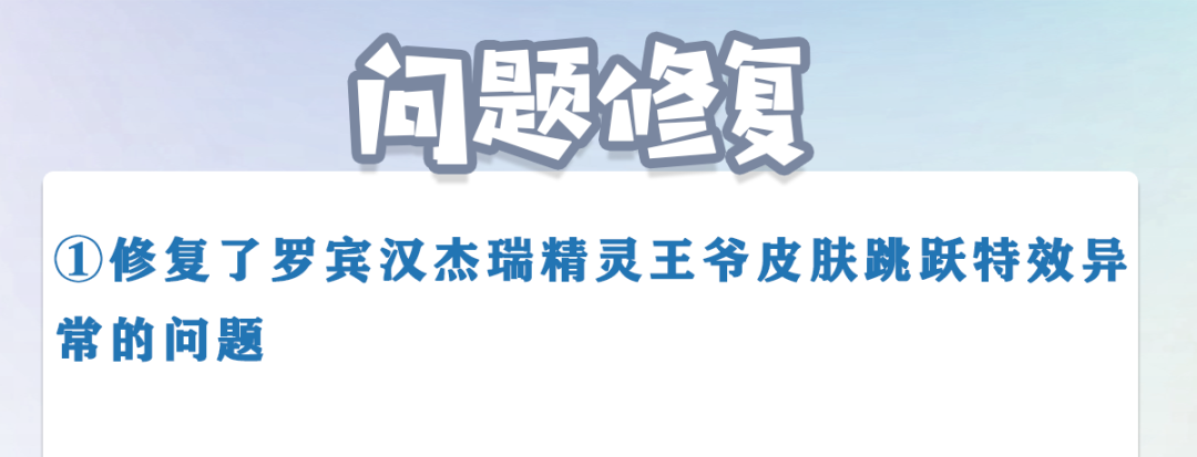 1.修复了罗宾汉杰瑞精灵王爷皮肤跳跃特效异常的问题