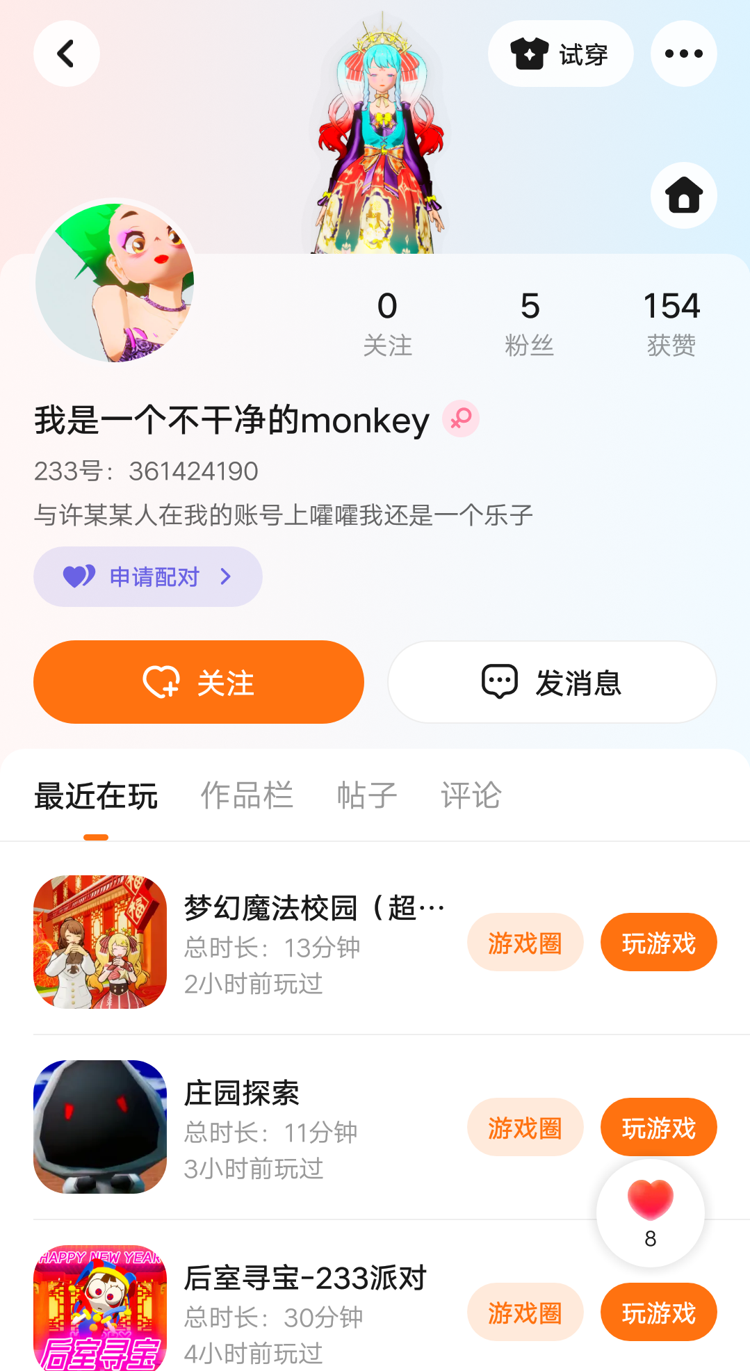 冉星的第三次黑历史,很不幸,我来晚了,他已经把他的服装换回去了,但是你们可以仔细瞧他的简介和他的头像