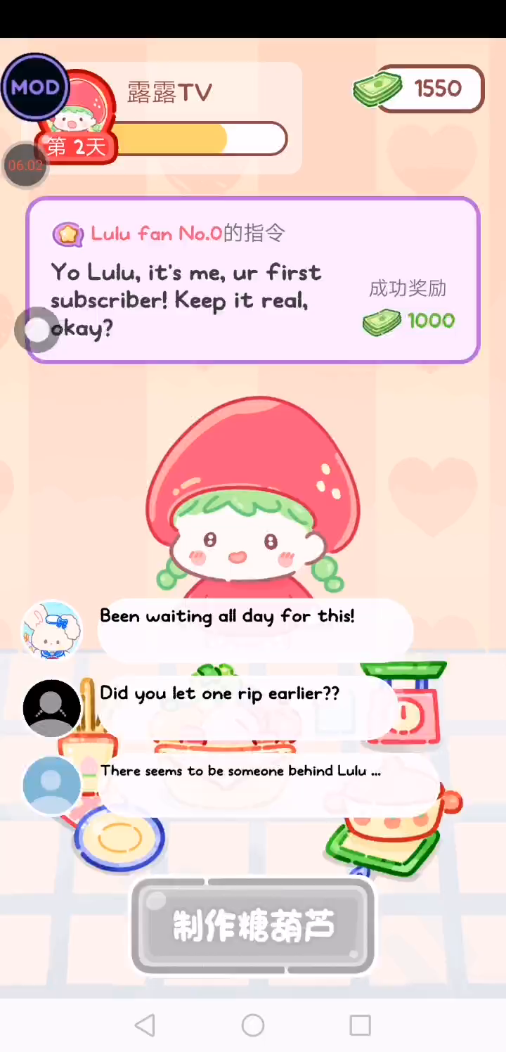 更新宠物!!! 「你进行草莓糖葫芦吃播的话,我就赞助100元。」 「脆口的声音太迷人了(°θ°)」 由于客人都被最近新开的许多糖葫芦店家抢走,曾经号称糖葫芦达人的父母因此卧病在床。 继承父母店面的主角露露开始糖葫芦吃播来宣传店面。 直到成为真正的糖葫芦达人那一天! 「今天我也要开始糖葫芦直播罗!( •o• )」 [串材料] 只有新鲜的水果的话,很难以一名吃播实况主存活下来。还要有松饼、地球软糖、青阳辣椒!利用奇特的材料制作糖葫芦吧。 [裹糖衣] 将材料串满竹签的话,就放进锅子搅动吧。唯有利用达人的秘法,才能裹出又薄又脆的糖衣。 [即时吃播] 咔哒咔哒!今天的吃播也大成功。热烈的聊天内容看起来反应也不错。看来得利用完成观众任务得到的赞助金来买新材料了! 来,准备好了吧?现在就马上挑战成为糖葫芦达人吧!