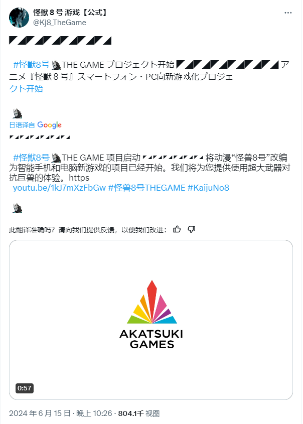 动画《怪兽8号》官宣确认将推出IP改编游戏《怪兽8号 The Game》(暂定名),游戏将登录PC及移动端。