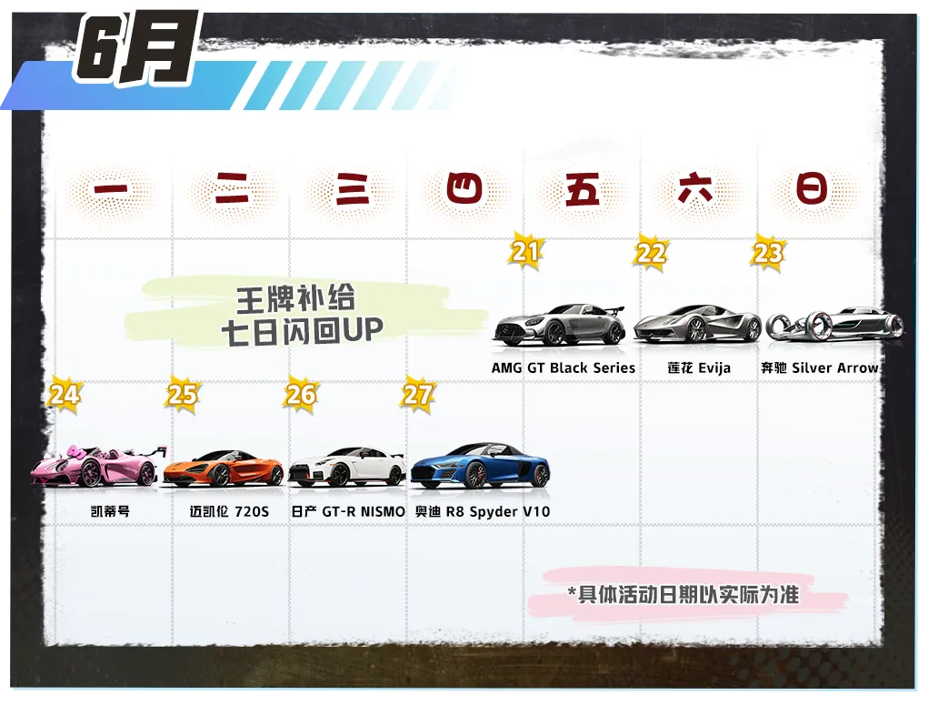 无需害怕背刺,就要任性提车!6月21日-6月27日,七日闪回活动将正式回归,连续7天,每天都会有一台王牌神车开启限时概率UP,“提车日程表”就在下方,赶紧保存下来别错过,祝各位车手都能一发出金,爽过提车瘾!