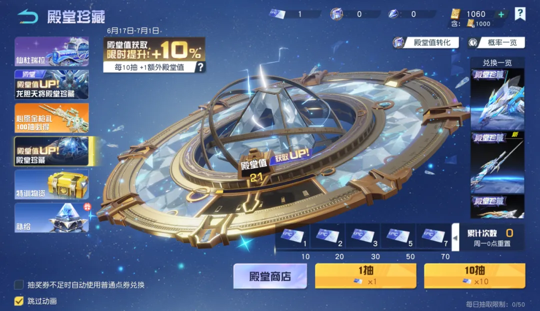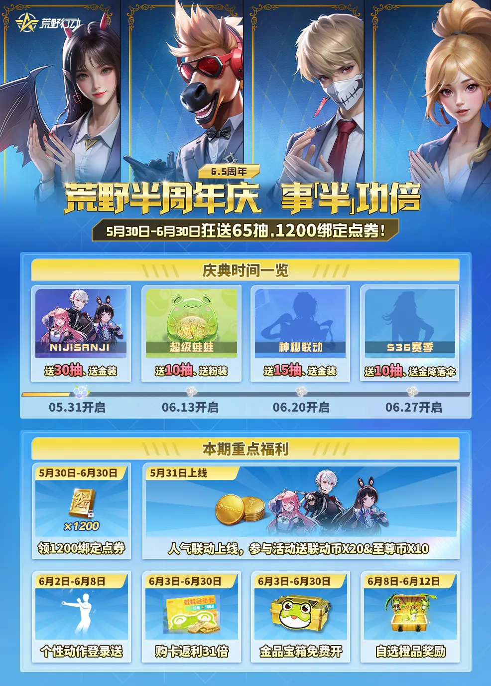 6月17日-7月1日,殿堂值获取限时提升10%!每10抽就能+1额外殿堂值,助力每个荒友的每一份殿堂梦!还有售价6元,返利高达31倍,价值1800点券的【蛙蛙会员卡】,618我们超级加倍!以及周周都有,从不缺席的6元粉装,让大家实现穿衣自由!