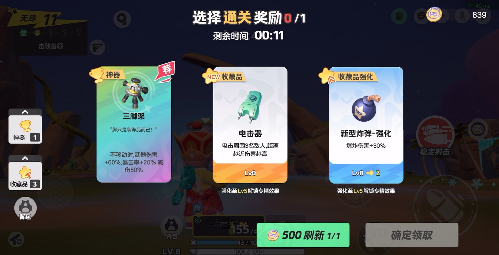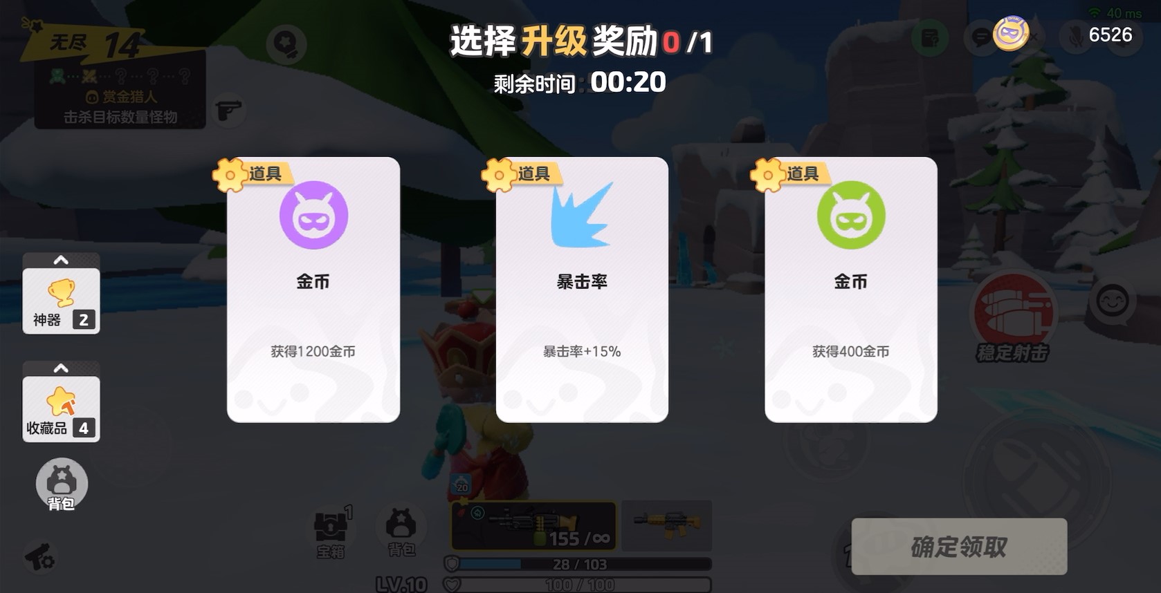 战备最后一步,选择升级奖励~机枪的弹匣容量虽大,但单发伤害偏低,所以能提升单发伤害的暴击率为道具首选,其次是武器伤害和暴击伤害,三重道具叠加,刷刷刷跳红色数字的快感谁懂?!