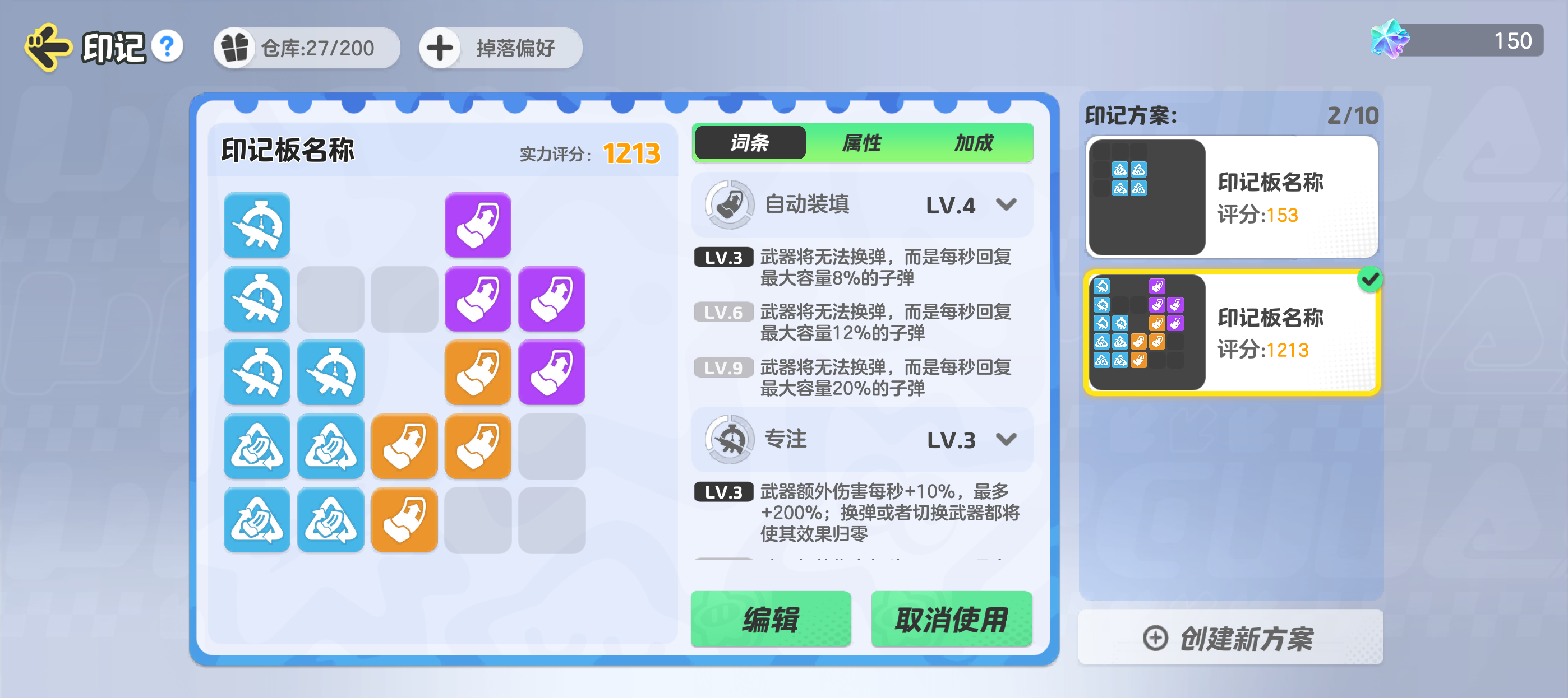 其次在编辑印记板时,词条也很重要,专注能够提升武器额外伤害,配合上自动装填,突突突根本停不下来~