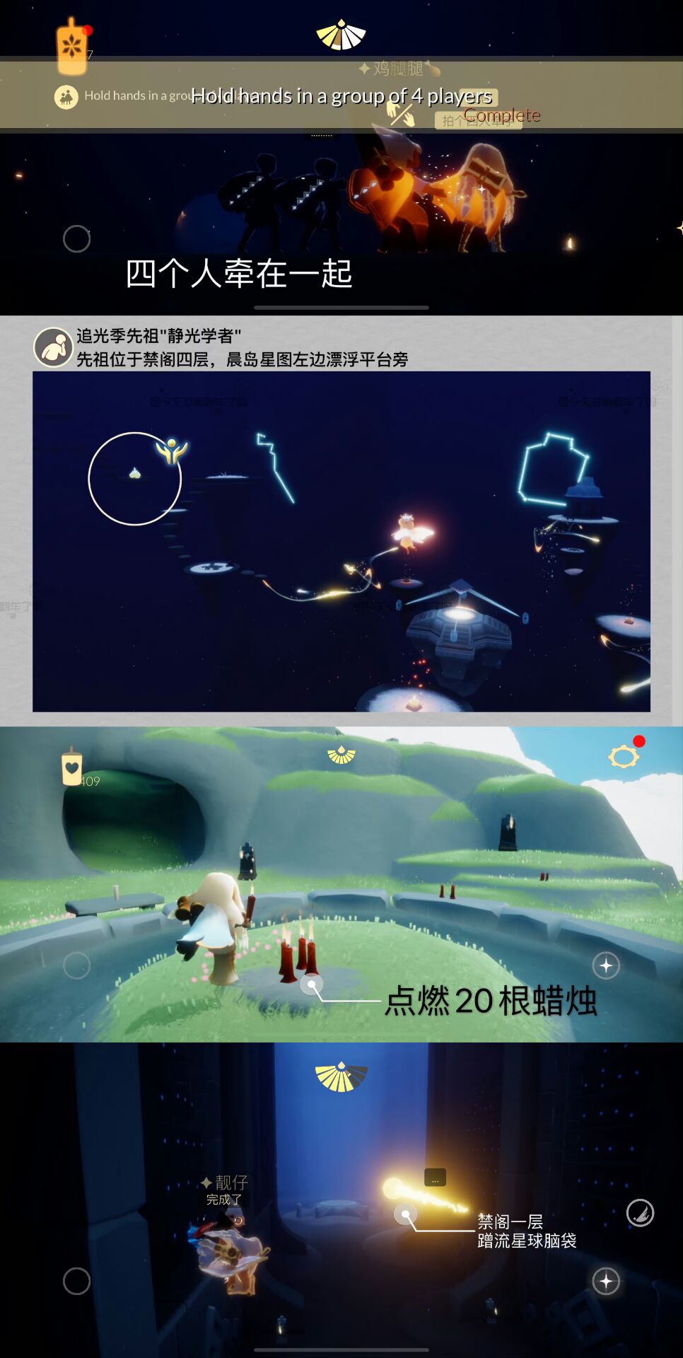 「四人牵手组队」四个人牵在一起,也可通过在【霞谷表演季剧场右边洞口的火盆旁】或【禁阁庇护所向导对面方罐子旁】打坐重温对应季节任务完成。