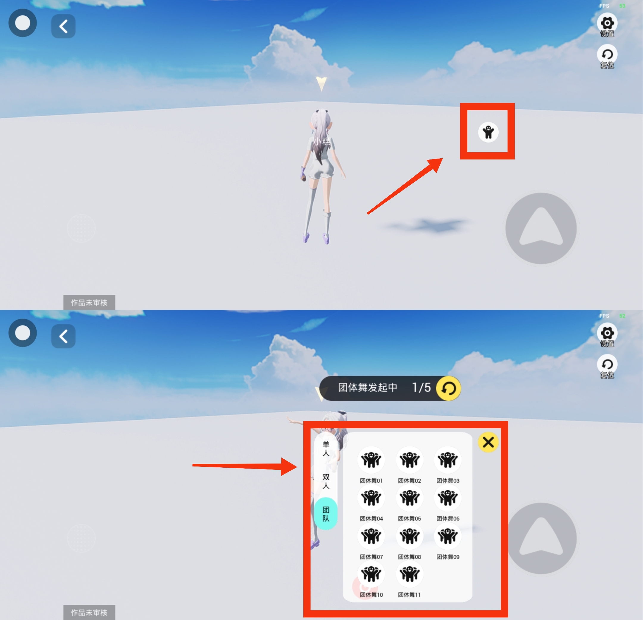 在游玩时,点击动作按钮,可以切换不同的动作列表,自由选择单人/双人/团队(即多人)动作。注意~发起双人动作以后需等待15s,没有人同意才可以切换其他的动作哦~