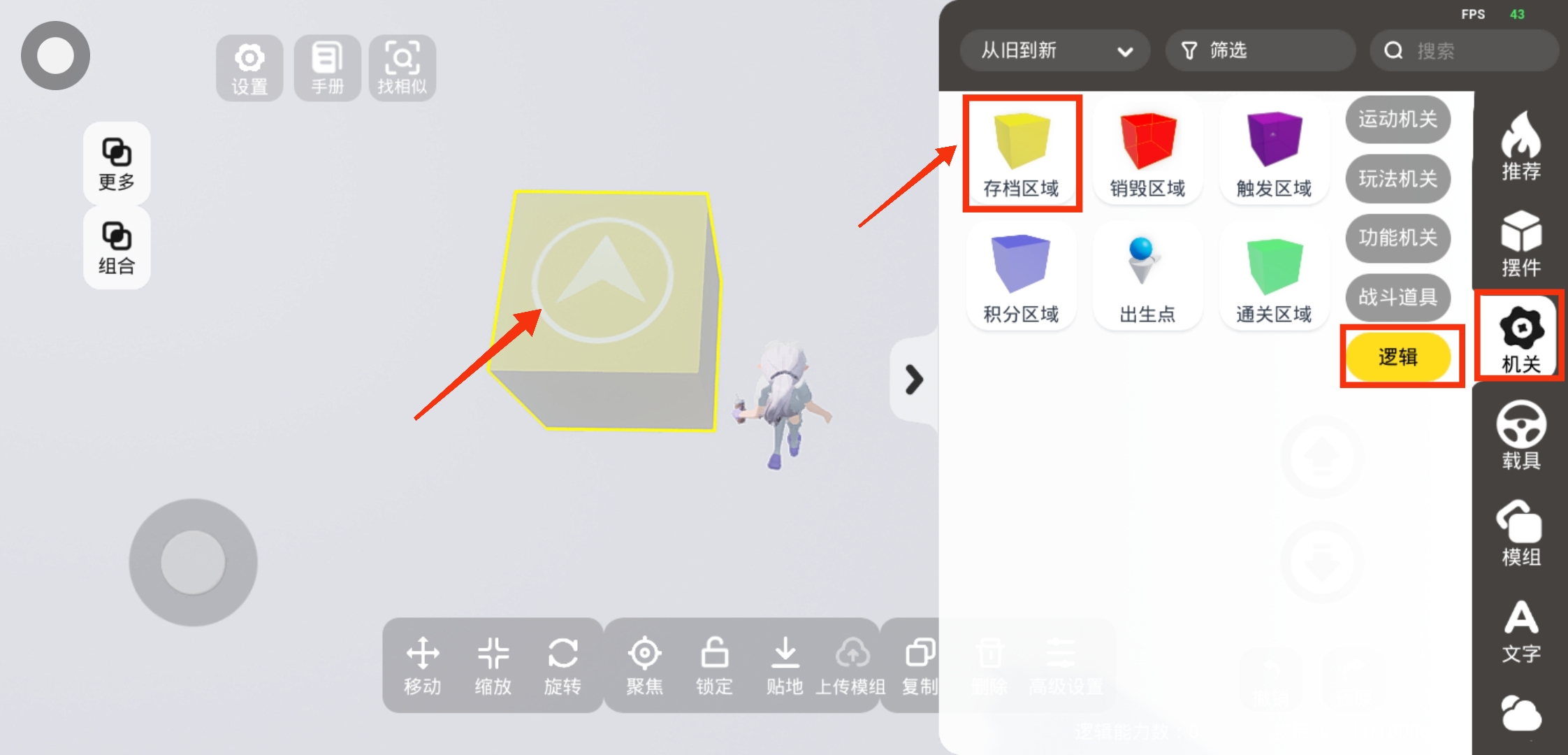 在【机关】-【逻辑】,选择【存档区域】,可以看到存档区域增加了一个箭头图案,用来记录该存档区域的正方向。即在游玩时,在存档区域复活或复位时,将面向复位到该存档区域的箭头指示方向哦~