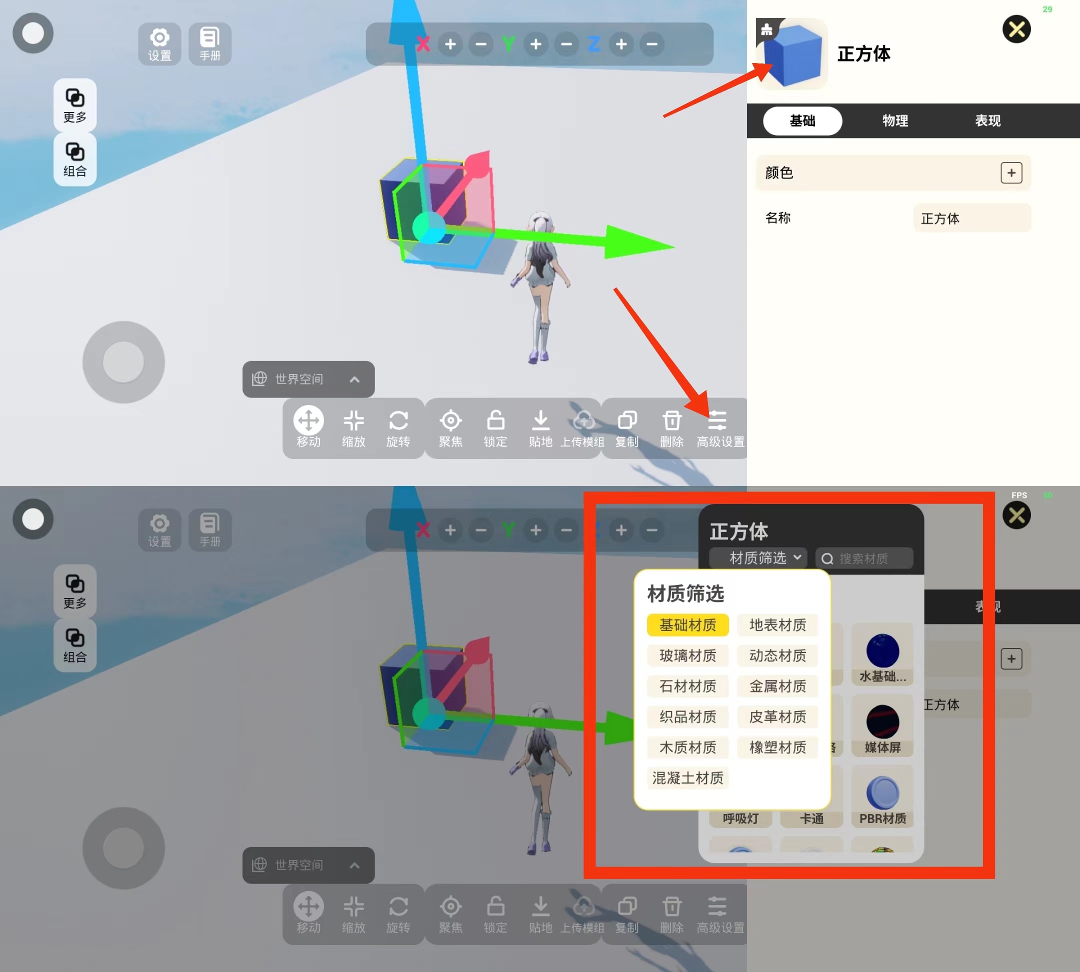 点击下方操作栏的【高级设置】,再点击上方物体图标就可以看到新增的超多材质内容,可以通过筛选来选择自己喜欢的材质哦~