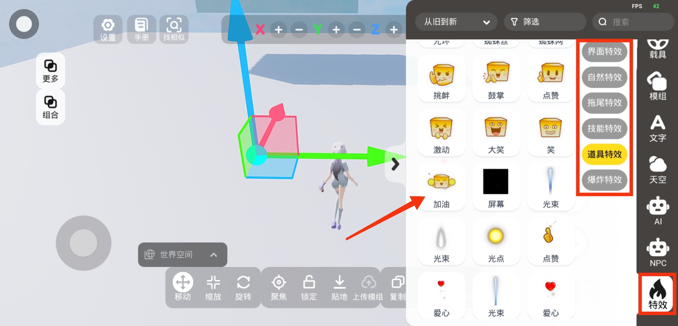 在右侧下拉找到【特效】,在界面/自然/拖尾/技能/道具/爆炸特效分页栏内,超多特效可供选择哦~