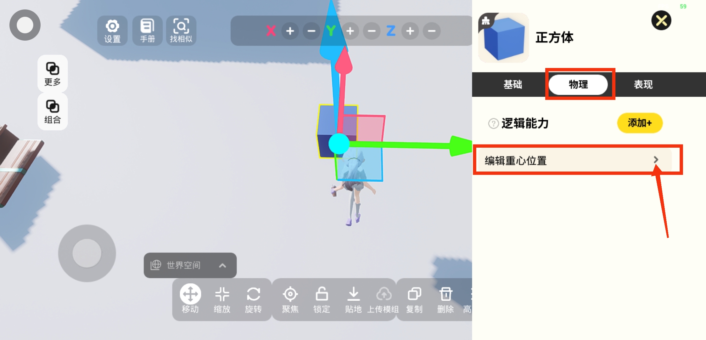 选中物体,在下方操作栏的【高级设置】-【物理】-【编辑重心位置】,可以自由调整该物体的X、Y或Z坐标轴的重心偏移位置~