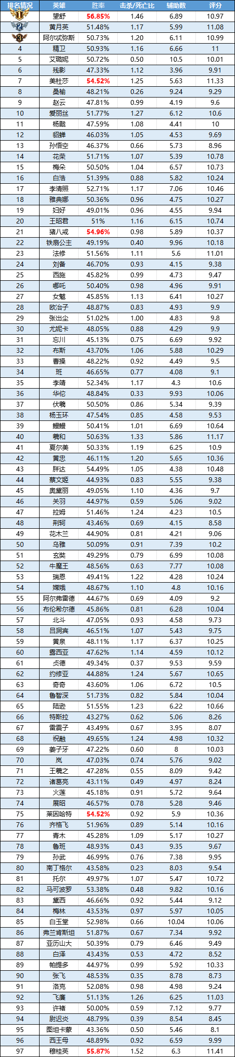 排序:榜单按出场率由高到低排序,标红为当前数列前5。