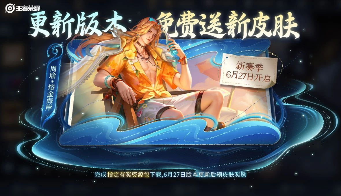 6月27日版本更新后还可以免费领取周瑜-熔金海岸皮肤!白嫖皮肤喜加一!噢耶!