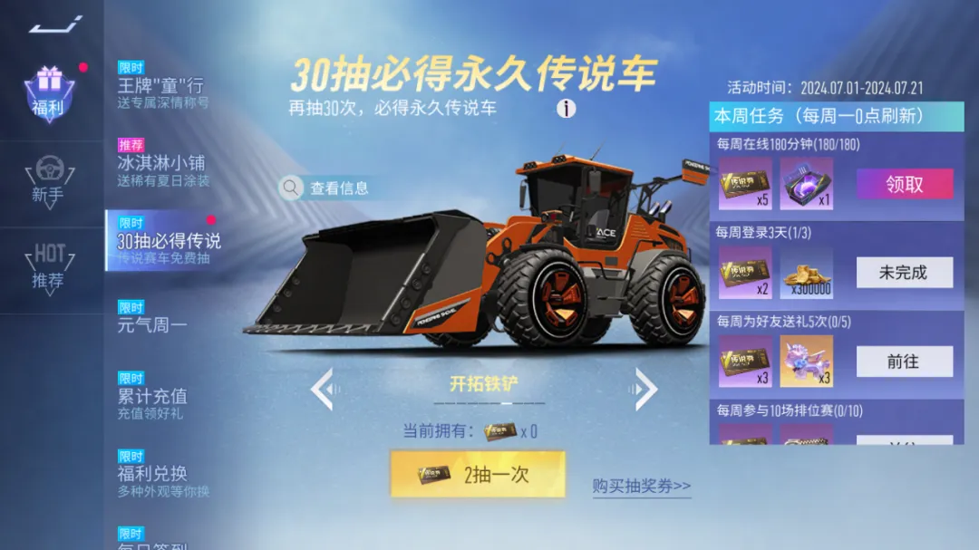 30抽必得永久传说车!7月1日~7月21日活动期间完成每周任务即可获得“传说券”,各位车手可以使用传说券进行抽奖,每30抽必得一辆永久传说车,若车手们已经拥有奖池内全部车辆,则30抽必得传说蓝图自选包!