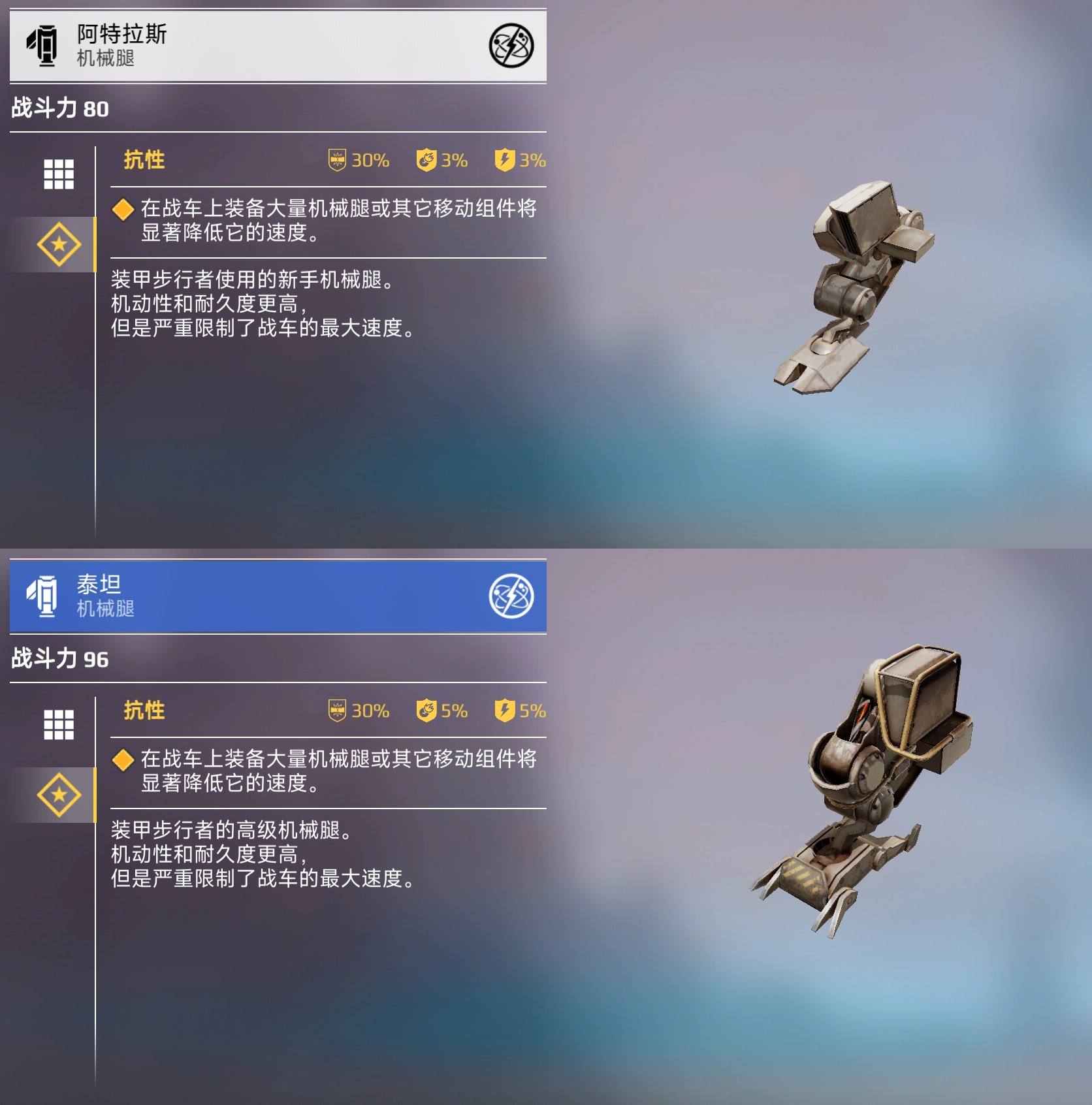 当各位工程师初次进入游戏时,他们可以选择战车“秒差距”来获取普通(白色)品质的机械腿“阿特拉斯”。随后,他们也能迅速解锁稀有(蓝色)品质的“泰坦”。