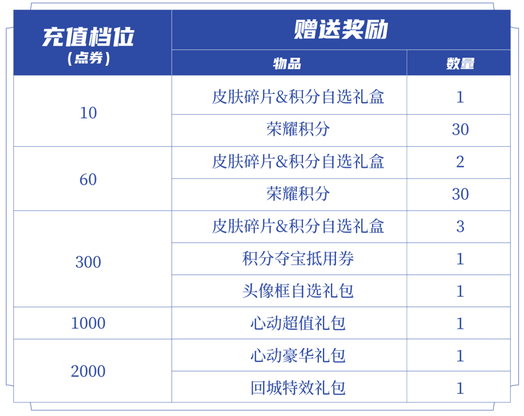 ◈皮肤碎片&积分自选礼盒:打开礼包可任意选择以下奖励之一:荣耀积分*10或皮肤碎片*1