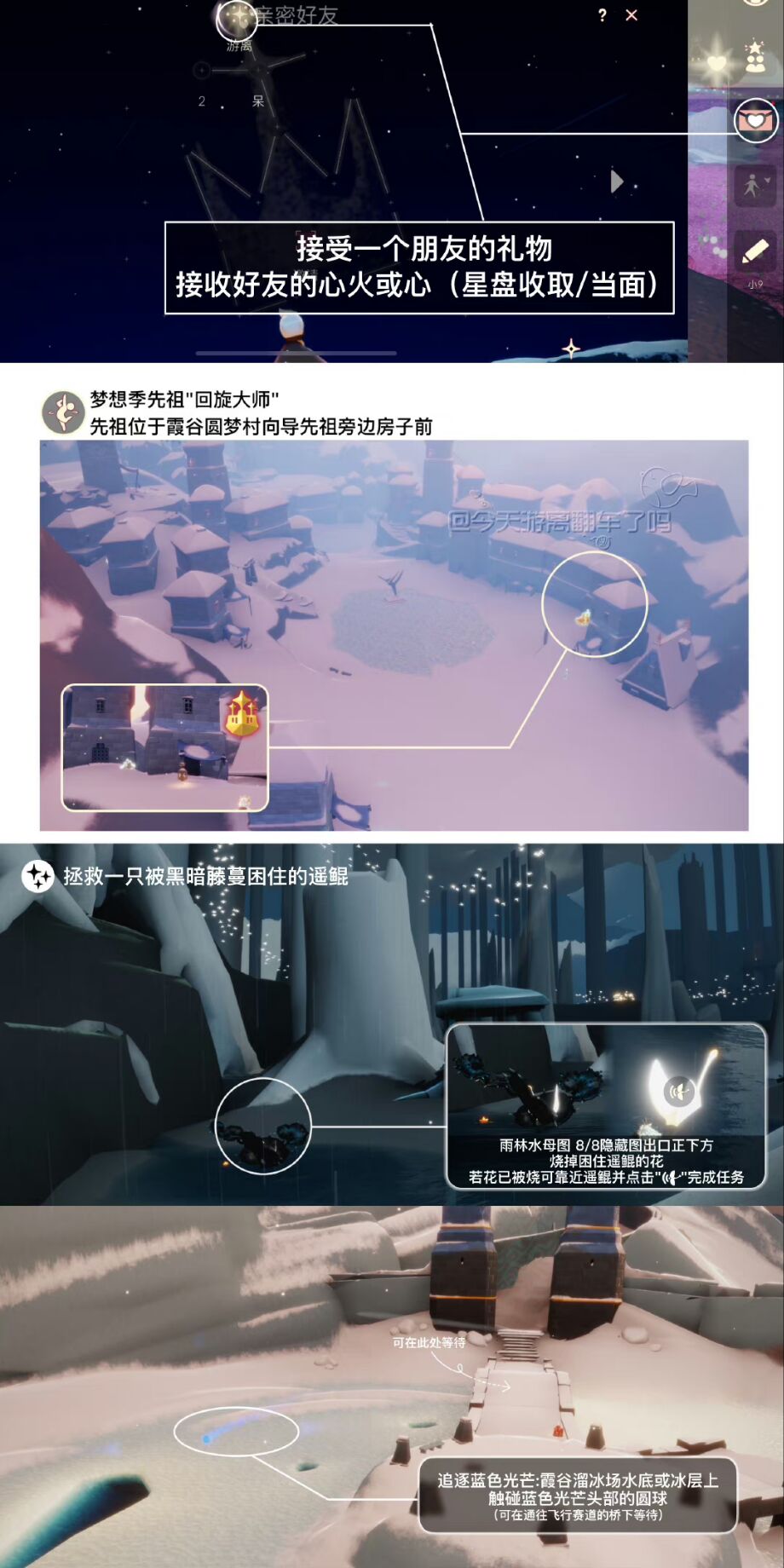 《 光遇 》 游戏中每天的每日任务及大蜡烛的位置都不相同 , 玩家完成每日任务及收集大蜡烛都可以得到丰厚的兑换奖励 , 奖励可以用于兑换各种动作及道具 , 不过很多小伙伴不知道每日任务怎么做 , 又懒得自己去找大蜡烛的位置 , 我们汇总了每日任务的完成攻略以及蜡烛位置 , 一起来看看吧 !