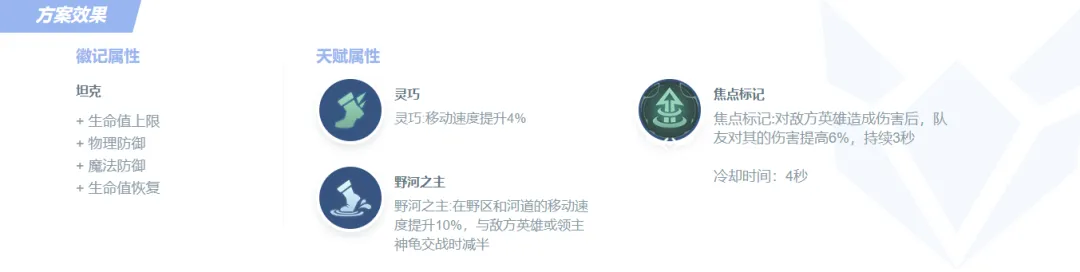徽记天赋第一二层选择[灵巧]和[野河之主]提升移速,方便游走支援与拉扯作战;