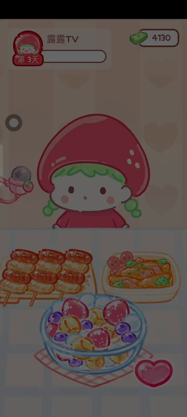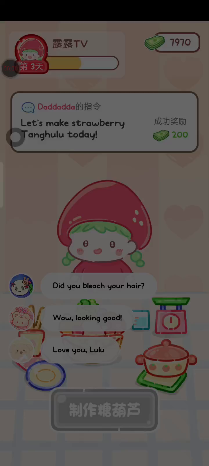 更新宠物!!! 「你进行草莓糖葫芦吃播的话,我就赞助100元。」 「脆口的声音太迷人了(°θ°)」 由于客人都被最近新开的许多糖葫芦店家抢走,曾经号称糖葫芦达人的父母因此卧病在床。 继承父母店面的主角露露开始糖葫芦吃播来宣传店面。 直到成为真正的糖葫芦达人那一天! 「今天我也要开始糖葫芦直播罗!( •o• )」 [串材料] 只有新鲜的水果的话,很难以一名吃播实况主存活下来。还要有松饼、地球软糖、青阳辣椒!利用奇特的材料制作糖葫芦吧。 [裹糖衣] 将材料串满竹签的话,就放进锅子搅动吧。唯有利用达人的秘法,才能裹出又薄又脆的糖衣。 [即时吃播] 咔哒咔哒!今天的吃播也大成功。热烈的聊天内容看起来反应也不错。看来得利用完成观众任务得到的赞助金来买新材料了! 来,准备好了吧?现在就马上挑战成为糖葫芦达人吧!