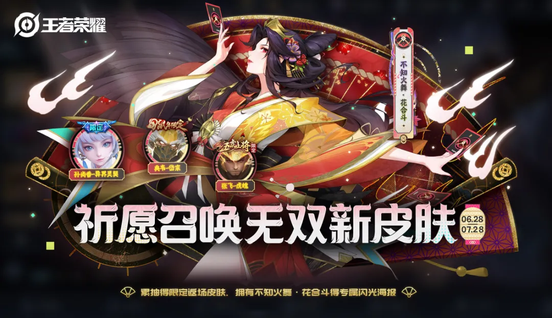◈ 活动奖励:【不知火舞-花合斗】、【孙尚香-异界灵契】、【张飞-虎魄】、【典韦-岱宗】、随机皮肤、无双券、枫叶、皮肤碎片等