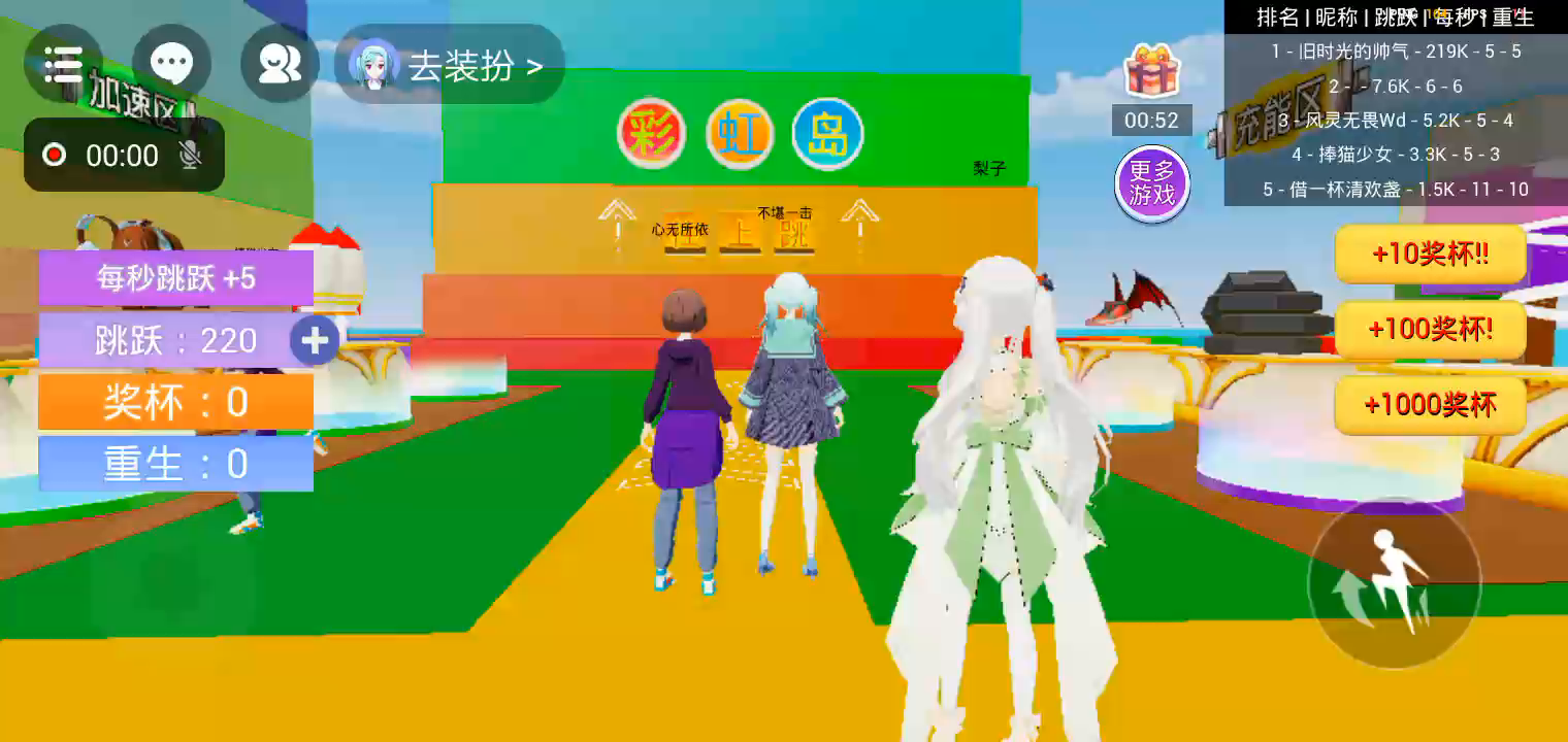 欢迎来到《看谁跳的高》,每秒跳跃值都会增加,跳到塔顶重生,就可以获得奖杯。用奖杯进行抽奖,可以增加每秒增加的跳跃值。 把你的最好成绩截图获录制视频发到游戏圈,让别人羡慕一下吧~