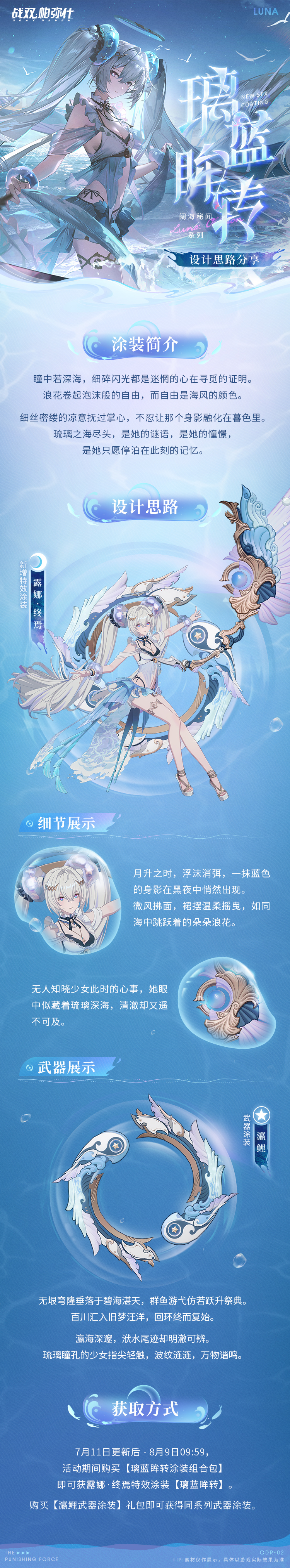 7月11日更新后 - 8月9日09:59,活动期间购买【璃蓝眸转涂装组合包】即可获得露娜·终焉特效涂装【璃蓝眸转】。