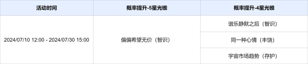 ● 活动期间,限定5星光锥「偏偏希望无价(智识)」,4星光锥「谐乐静默之后(智识)」「同一种心情(丰饶)」「宇宙市场趋势(存护)」跃迁成功概率限时提升。