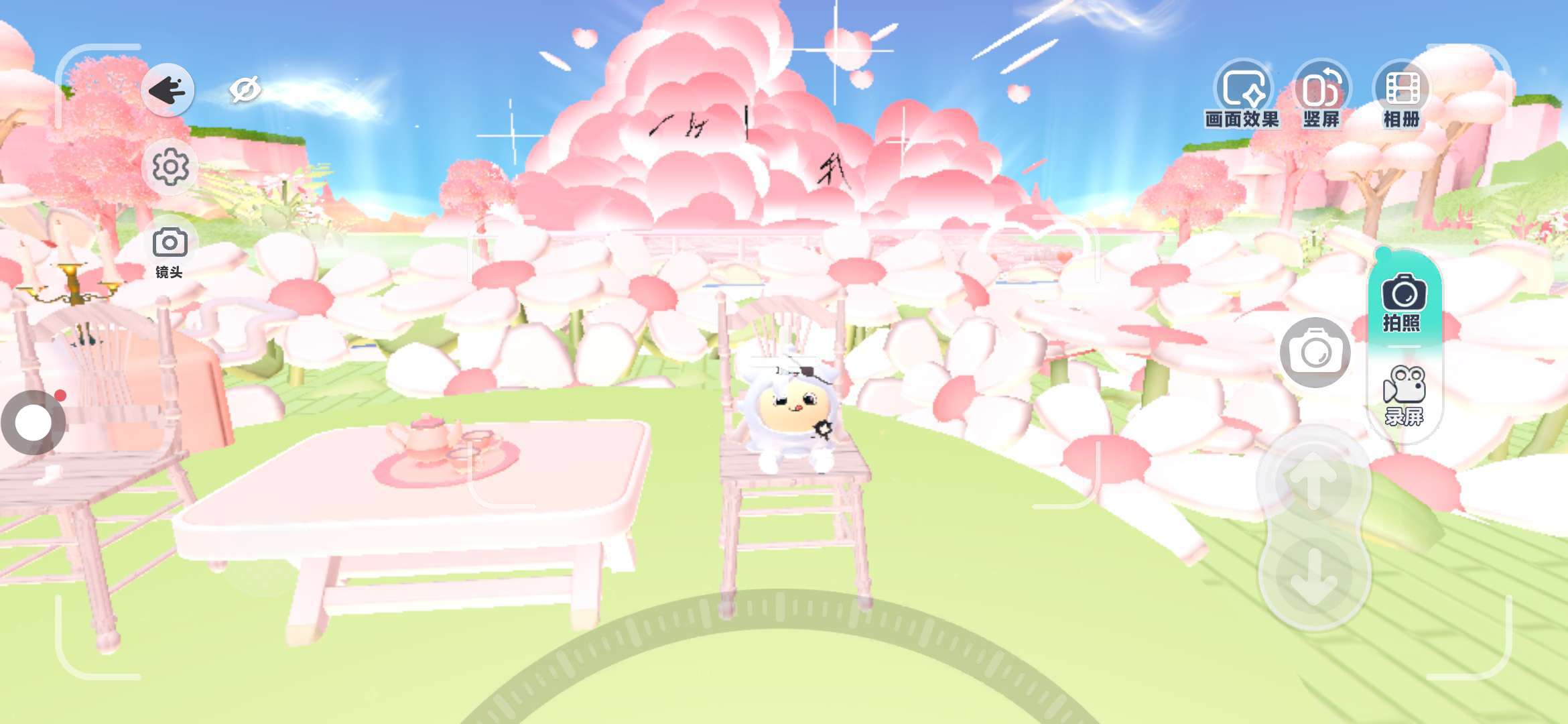 这里啦,闲来无事,上到椅子上喝茶啦。这个美图真的好喜欢,因为后面几乎都是花,还有那粉粉嫩嫩的云