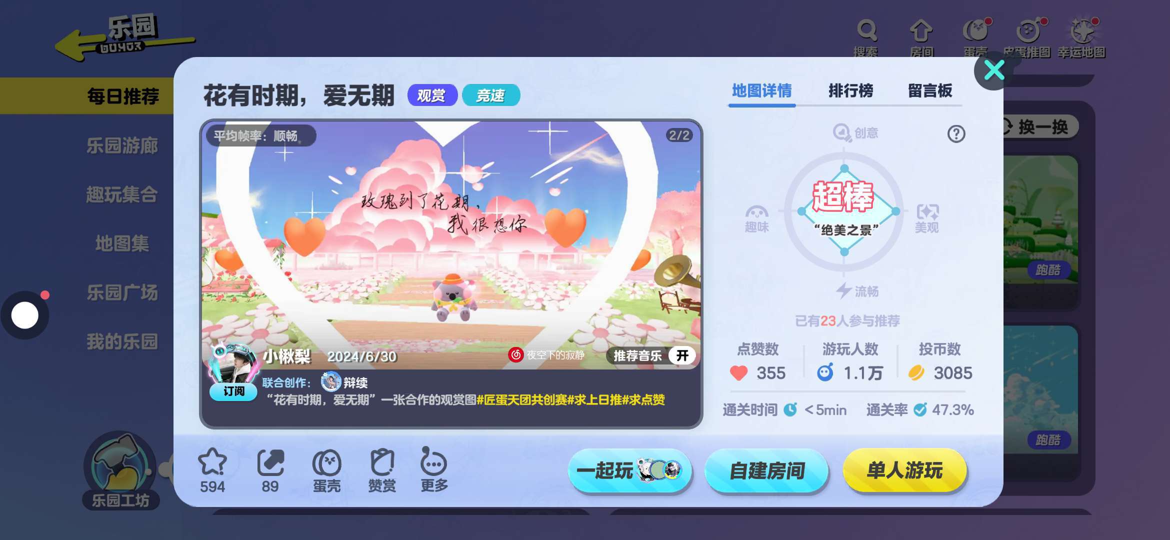 地图介绍:这是超级浪漫的地图,时间一定要和蛋搭子来打卡,真的超级喜欢这种粉粉嫩嫩自由的风格,快来玩吧。