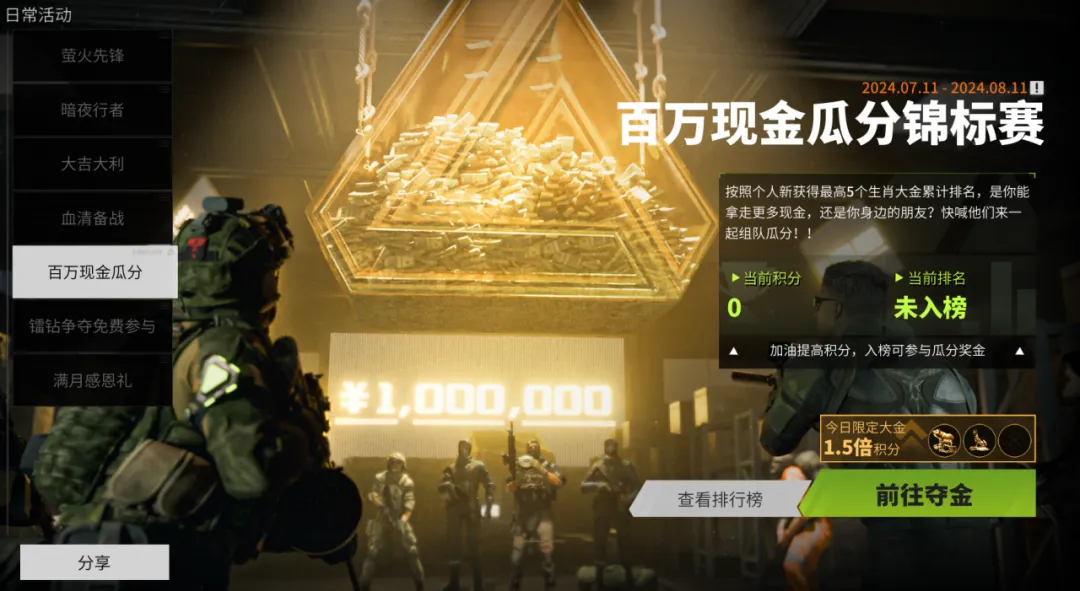 7月11日-8月8日活动期间,萤火虫们每局带出的崭新生肖大金,会根据前五个价值最高的生肖大金价值进行积分计算排行,按照排行名次瓜分100W现金!百万游戏币,不如百万真金福利!